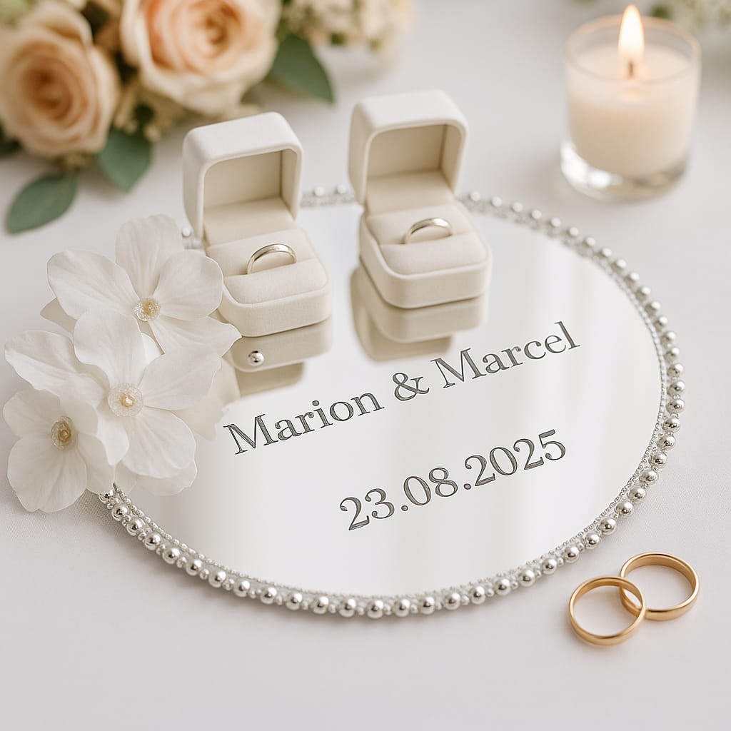 Verleihe eurem großen Tag eine ganz besondere Note mit dieser edlen, personalisierbaren Spiegelacrylplatte – perfekt für die Präsentation eurer Eheringe oder als stilvolles Detail auf dem Hochzeitstisch.